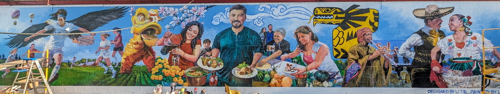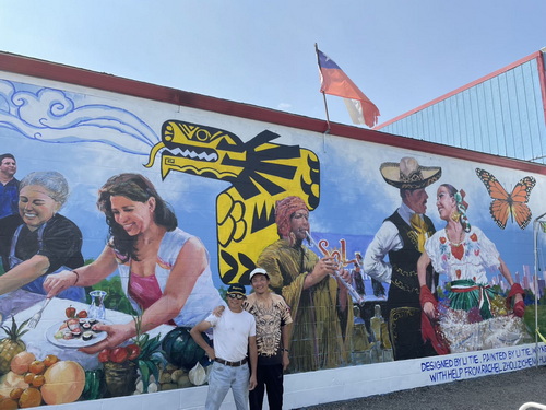 (Comprehensive Report) Tie Li and Wayne Chen, president and member of the Oregon Chinese Artists Association, respectively, painted the huge mural "Together we have a bright future" together. The project was finished on August 28, 2023.