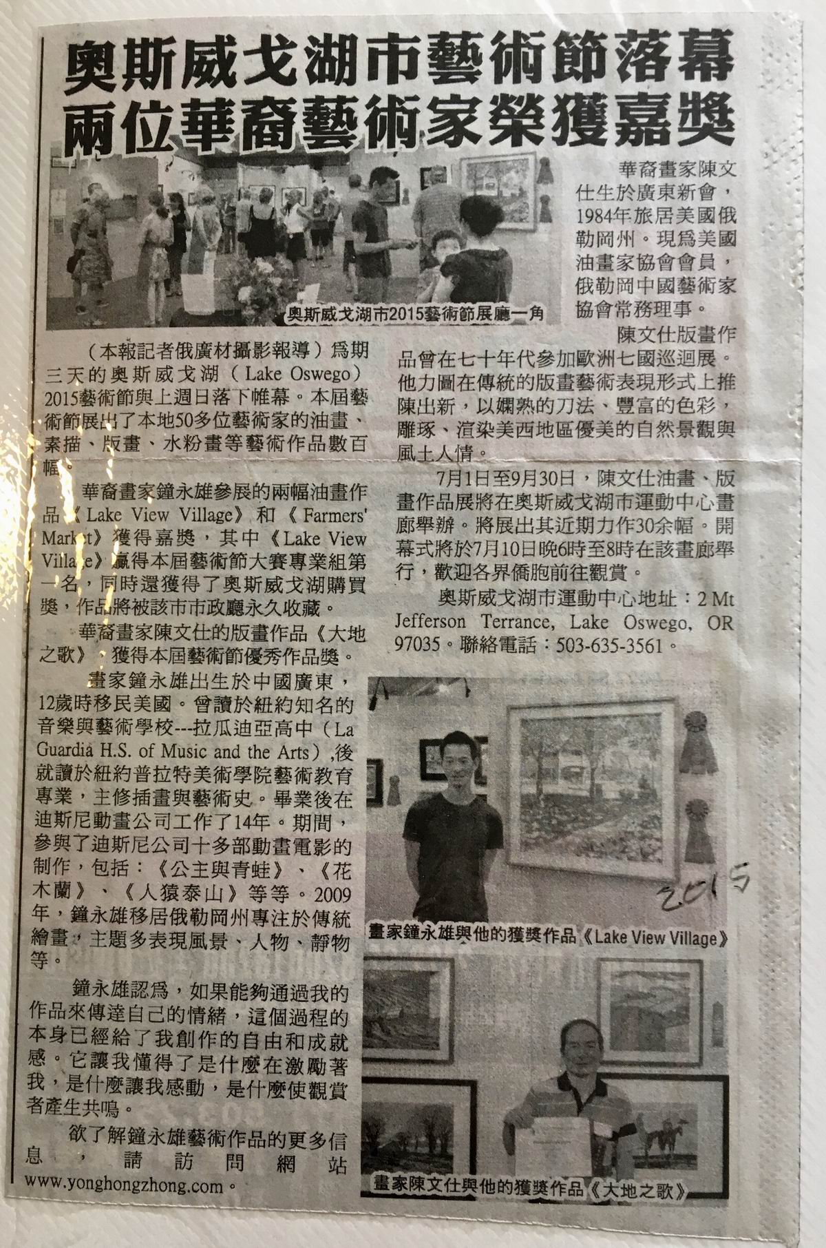 (2015) Lake Oswego Art Festival is successfully completed. More than 50 local artists participated in the event. The artworks included oil paintings, drawings, water colors, and other forms of arts. Chinese artist Yongxun Tong won the awards on two of his oil paintings. One of it became the permanent collection of Lake Oswego, and displayed on the city hall.